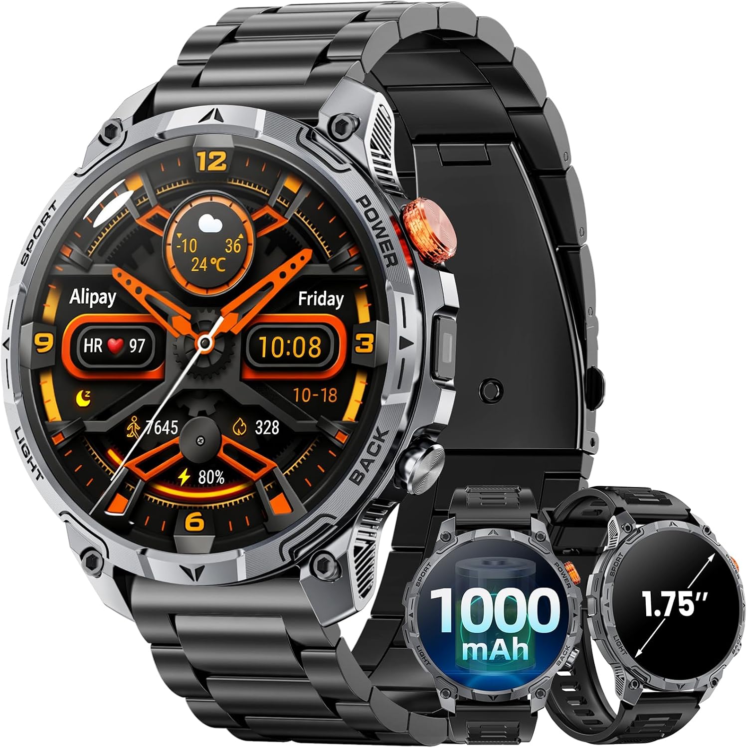 Militär Smartwatch Herren, mit1000-mAh-Akku/2 Armbändern/1,75" HD Großes Display Sportuhr/110+ Sportmodi Fitnessuhr/LED Taschenlampen/24/7Herzfrequenz/Schlafmonitor/IP68 Wasserdicht für iOS Android